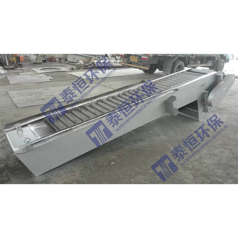 回轉式格柵除污機設備是由一種獨特的耙齒廠裝配成一組回轉格柵鏈。在電機減速器的驅動下,耙齒鏈進行逆水流方向回轉運動。耙齒鏈運轉到設備的上部時,由于槽輪和彎軌的導向,使每組耙齒之間產生相對自清運動,絕大部分固體物質靠重力落下。另一部分則依靠清掃器的反向運動把粘在耙齒上的雜物清掃干凈。按水流方向耙齒鏈類同于格柵,在耙齒鏈軸上裝配的耙齒間隙可以根據使用條件進行選擇。當耙齒把流體中的固態懸浮物分離后可以保持水流暢通流過。整個工作過程是連續的,也可以是間歇的。