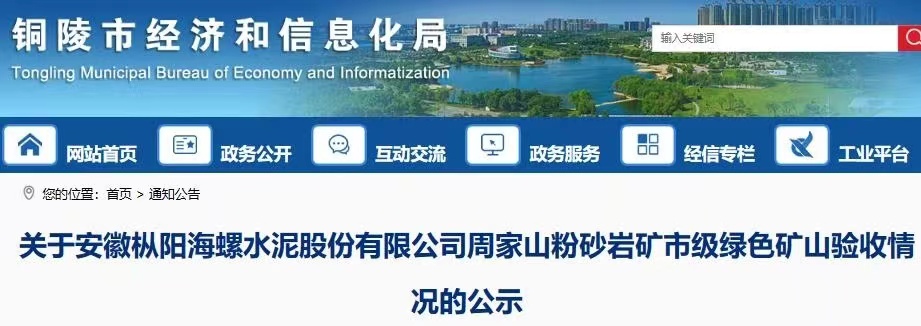 近日,安徽省銅陵市經(jīng)濟(jì)和信息化局發(fā)布關(guān)于安徽樅陽海螺水泥股份有限公司周家山粉砂巖礦市級(jí)綠色礦山驗(yàn)收情況的公示。